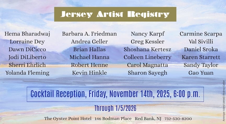 The Jersey Artist Registry, founded and curated by Ellen Martin, highlights the work of New Jersey visual artists. This exhibition features work in a variety of styles and media by twenty-four of its members. It will be a diverse show encompassing a wide range of media and styles.